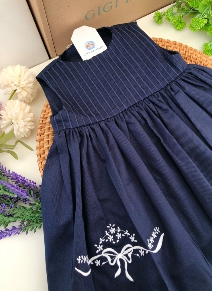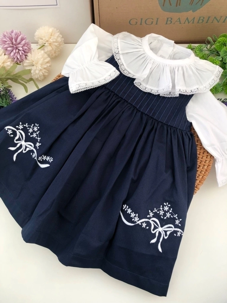 Conjunto de: vestido em fustão marinho bordado + blusa com manguinhas 3/4 (três quartos) e gola estilo europeu com renda coleção Infância Encantada.