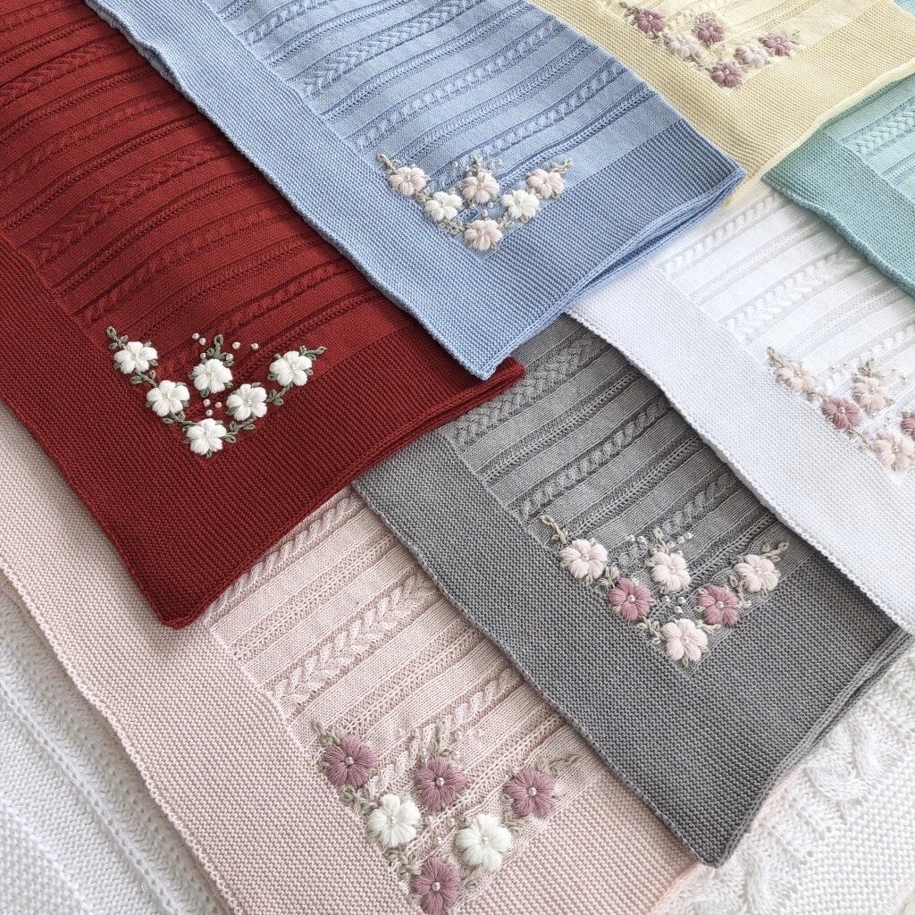 Adquira uma unidade da nossa exclusiva manta para bebê de tricô, com flores delicadamente bordadas à mão. Esta manta de bebê bordada não só é estética como também prática, medindo 80x80cm - perfeita para envolver seu pequeno com conforto e estilo.