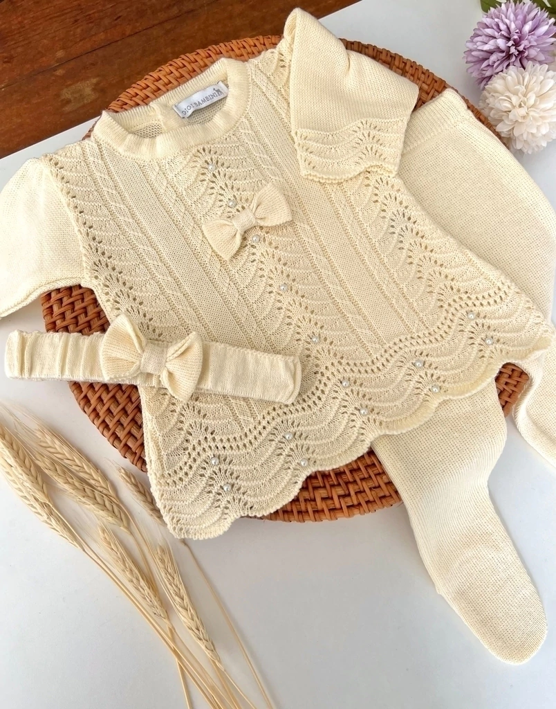 Outros acessórios não descritos também são vendidos separadamente. Este conjunto de saída de maternidade em tricô para bebê é ideal para garantir conforto e estilo ao seu bebê. A saída de maternidade amarela proporciona um visual encantador e único.