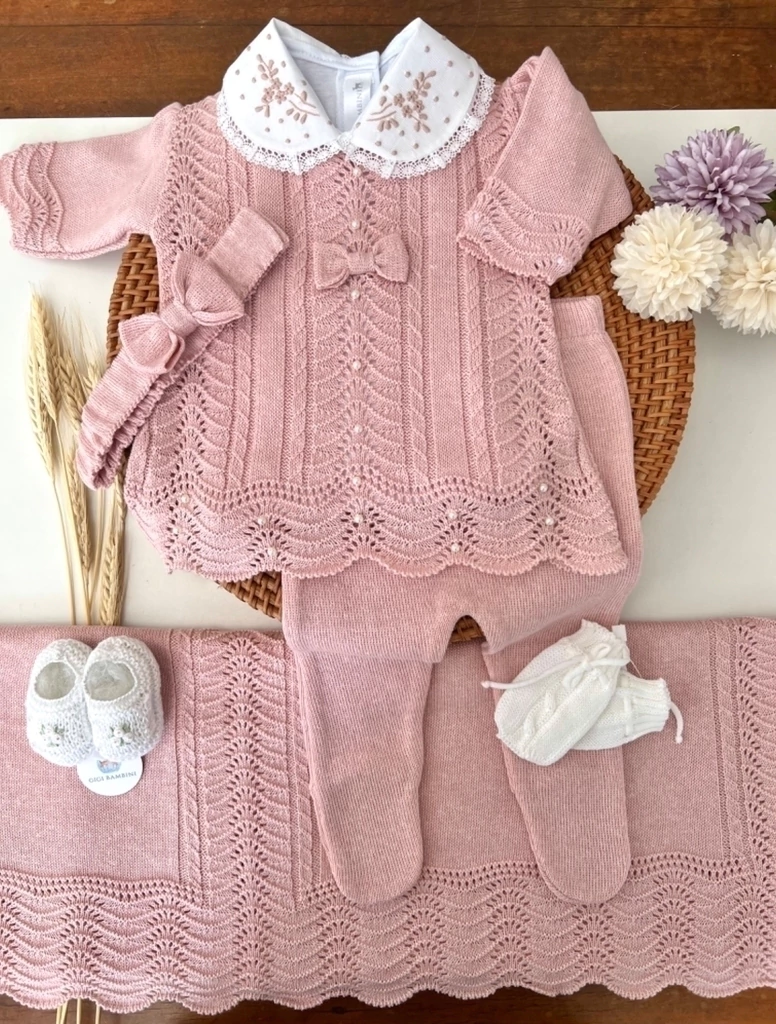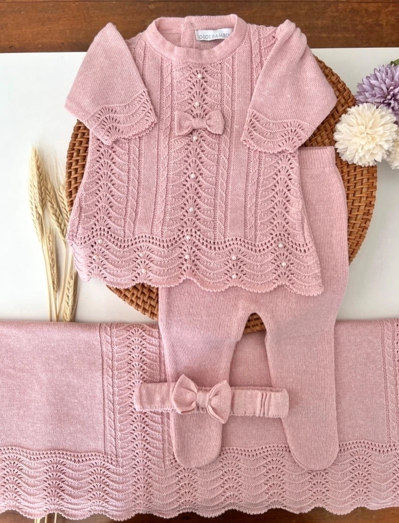 O nosso tricô é feito com linha própria para recém-nascidos, ideal para roupa de saída maternidade rosa: