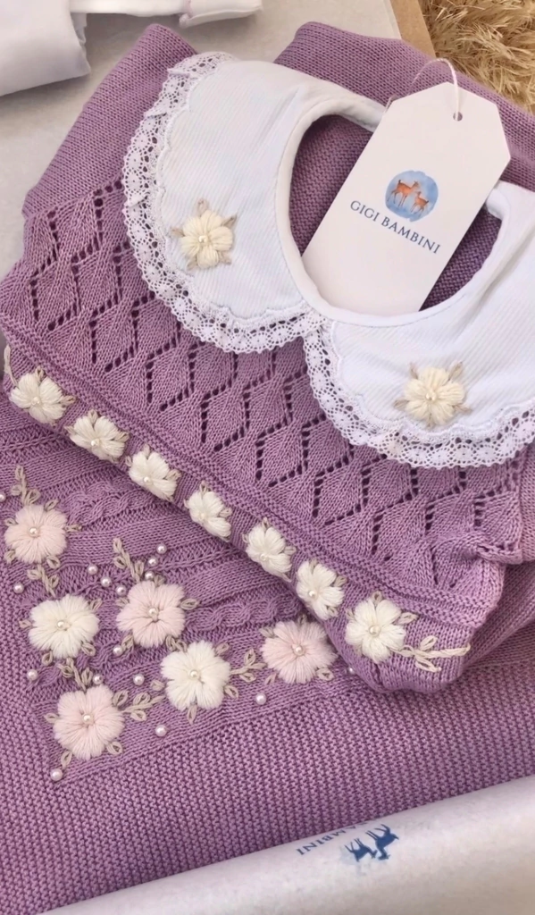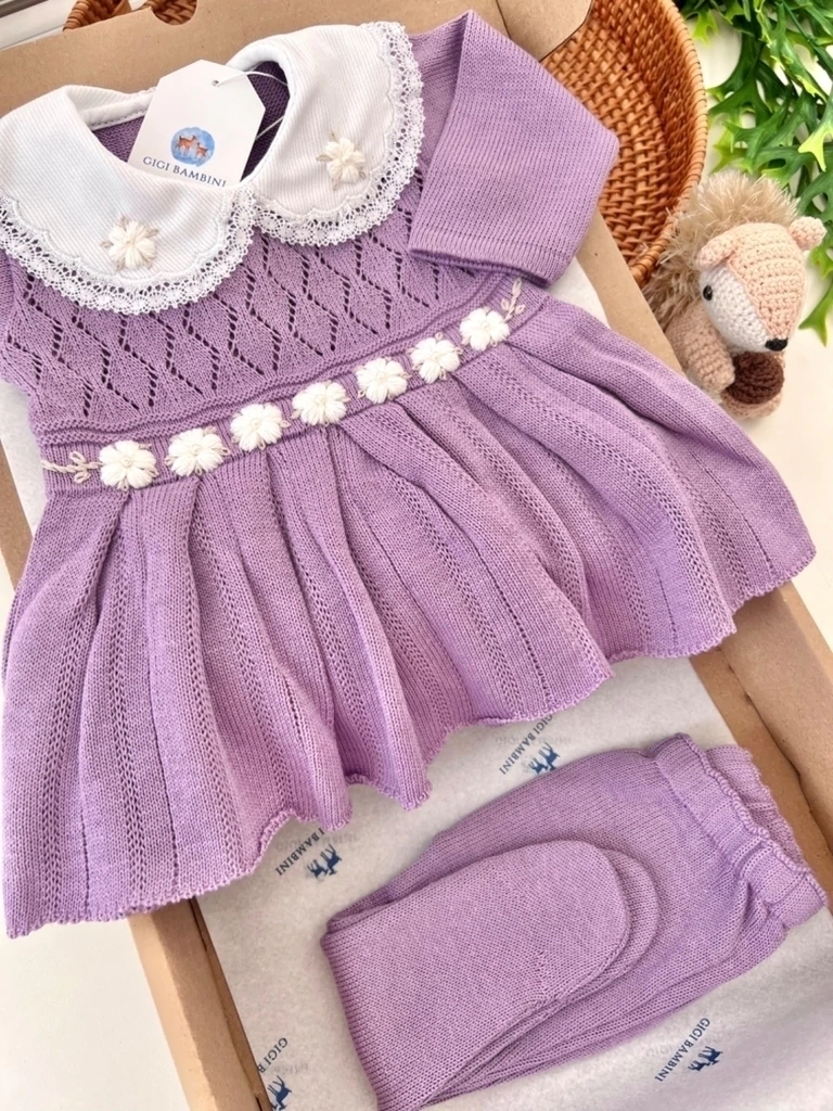 Combine essa roupinha com a manta Aurora roxa! Ela é do mesmo tom do tricô do vestido e calça.